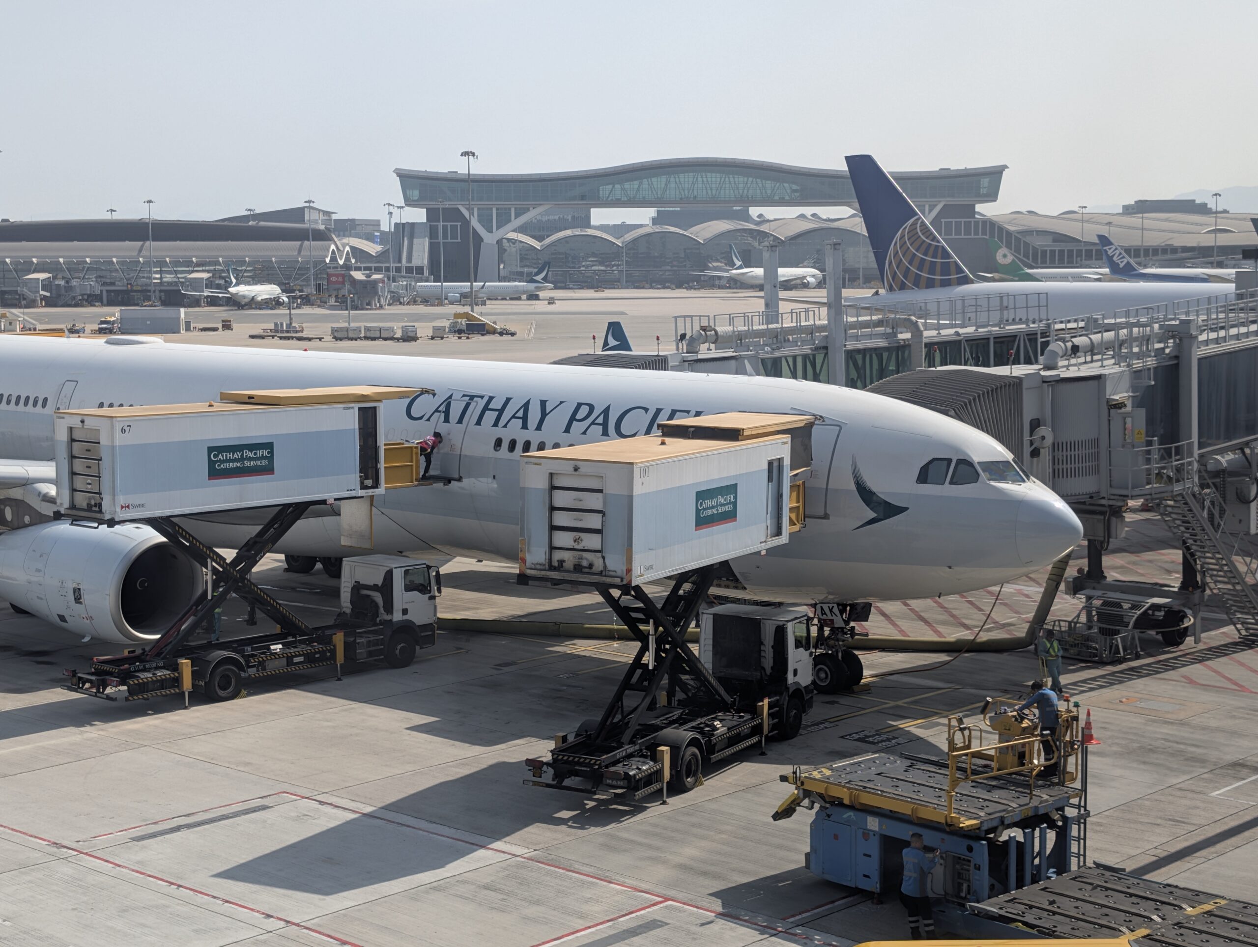 Der Tag startet mit dem Besten Sonnenschein, Aufstehen, Frühstück und dann hinüber zum Terminal 2. Koffer abgeben, dann ausreisen und dann durch die Sicherheitskontrolle (die Reihenfolge war neu). Natürlich kontrolliert auch die Airline nochmal – auch das Handgepäck, Sicherheit ist Nummer eins. Unsere Maschine steht schon auf ihrer Position, zwischen